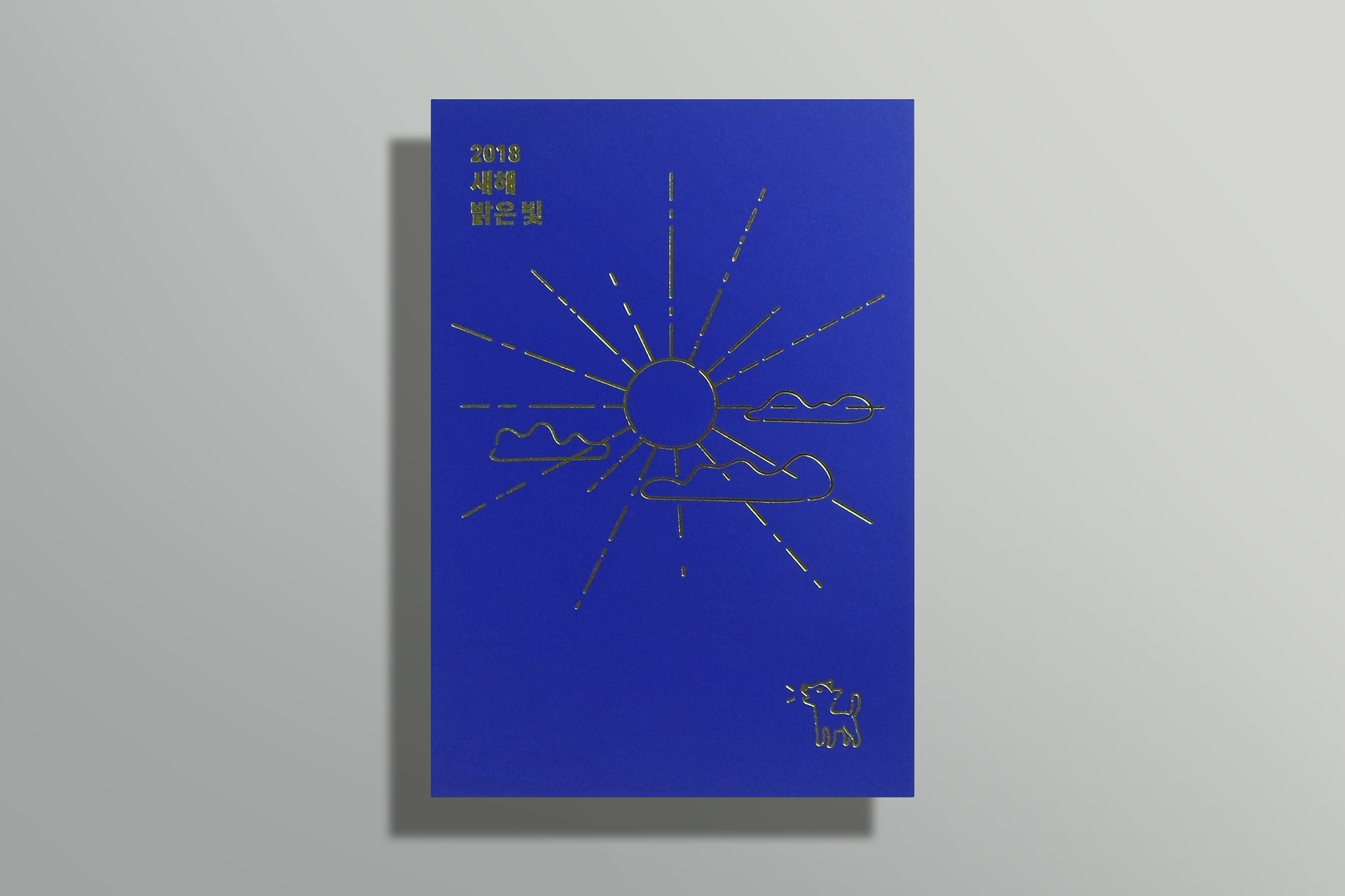 2018년 메타기획컨설팅의 연하장 디자인입니다. 경쾌한 컬러의 푸른 색지와 골드 핫포일 스탬핑 기법으로 새해의 기분을 표현했습니다. 태양빛을 보며 꼬리를 흔드는 강아지 그림으로 무술년의 특색을 담았고, ‘2018 새해 밝은 빛’이라는 간결한 슬로건을 통해 신년 인사와 덕담을 축약하여 표현했습니다.