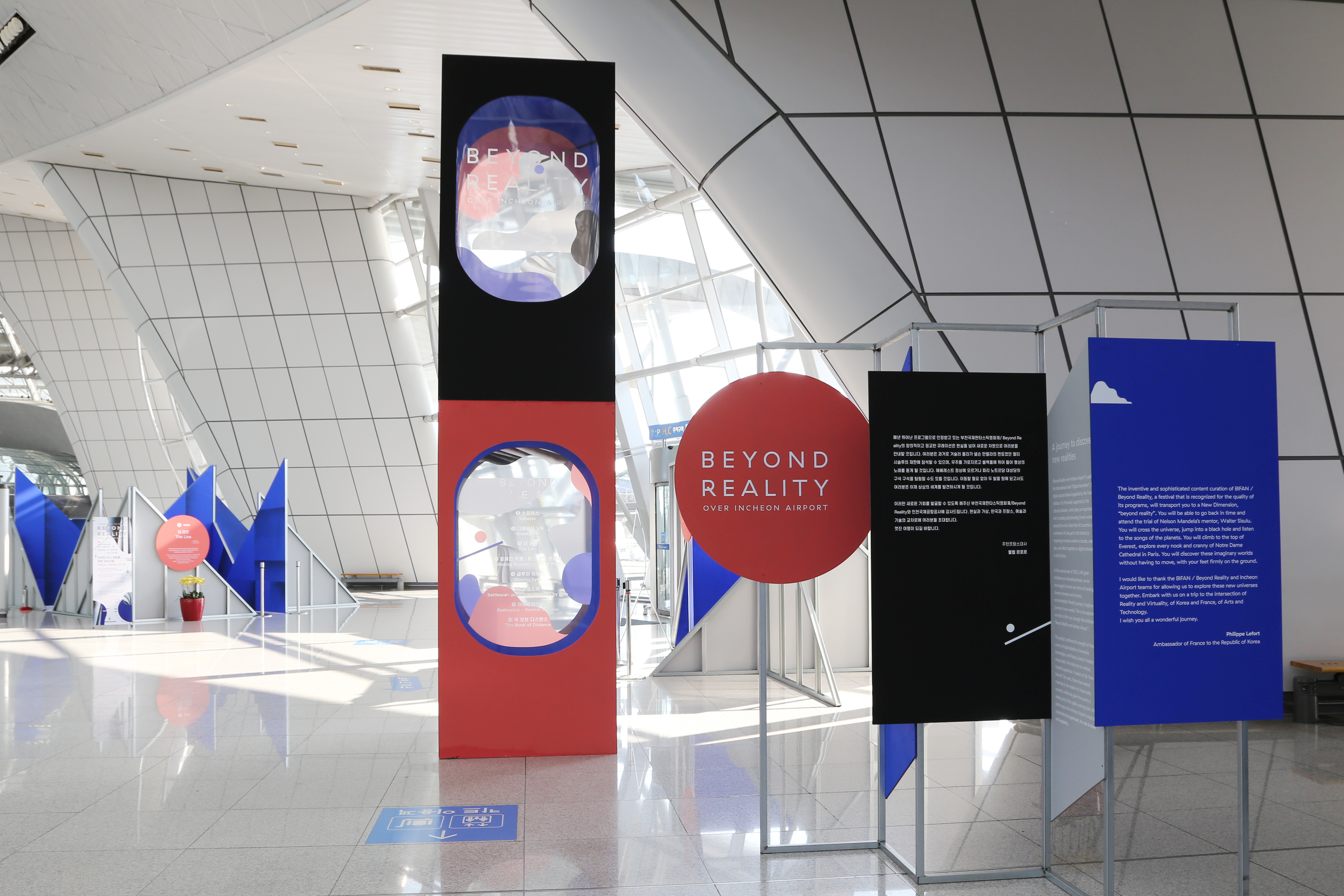 BIFAN과 주한프랑스대사관, 프랑스문화원, 인천국제공항이 공동 주최한 ‘Beyond Reality’의 아이덴티티와 공간 디자인을 담당했습니다. 인천국제공항 제1교통센터에서 열린 Beyond Reality는 세계의 주목할 만한 가상 체험 작품을 모아 소개하는 특별 섹션입니다. 새로운 기술이 적용된 장르인 만큼, CG 촬영에 이용되는 크로마키 블루 컬러를 콘셉트로 XR 체험부스를 디자인했고 그래픽 아이덴티티와 결을 맞춰 일관된 관객 경험을 제공할 수 있도록 디자인을 전개했습니다.