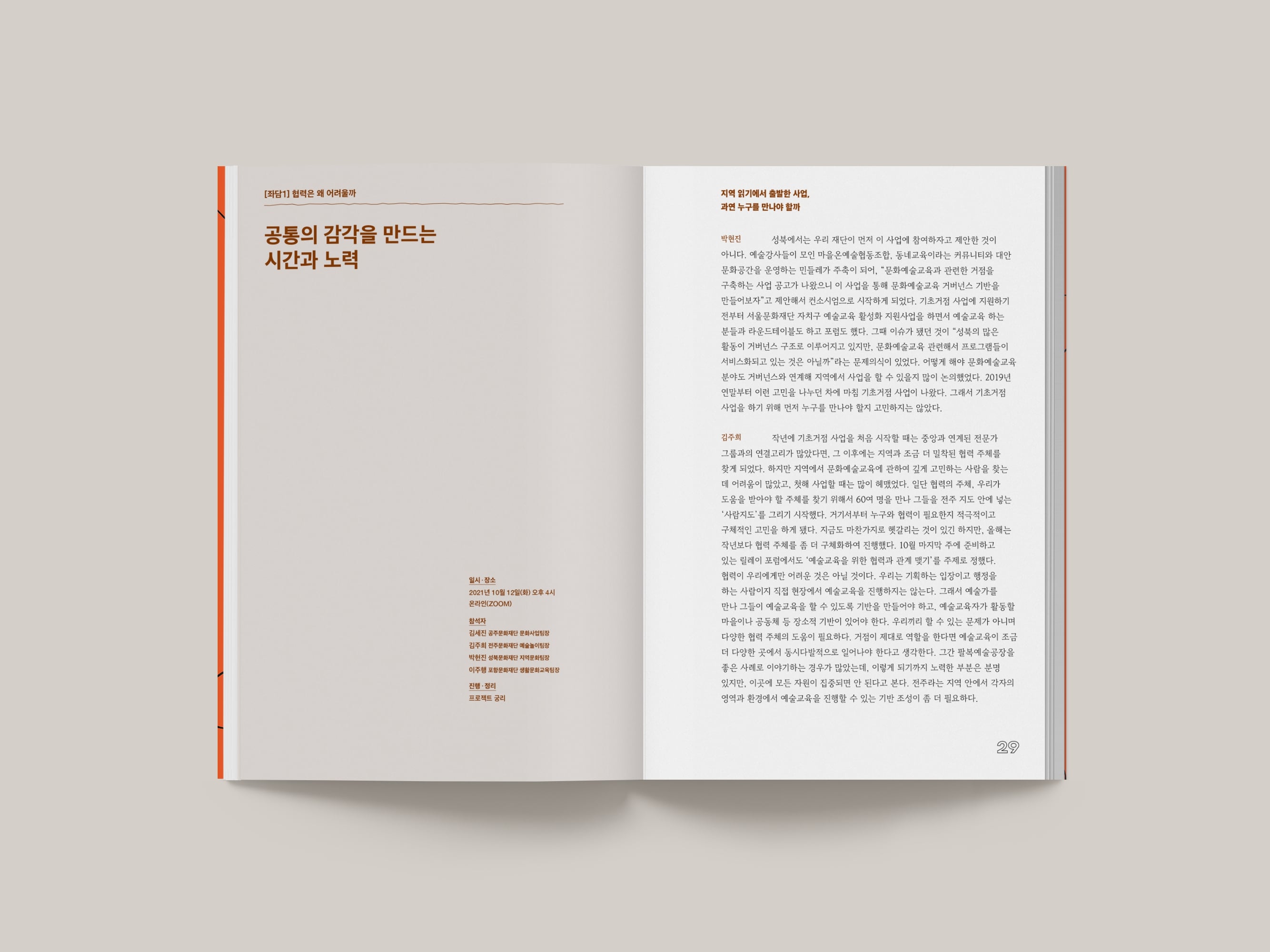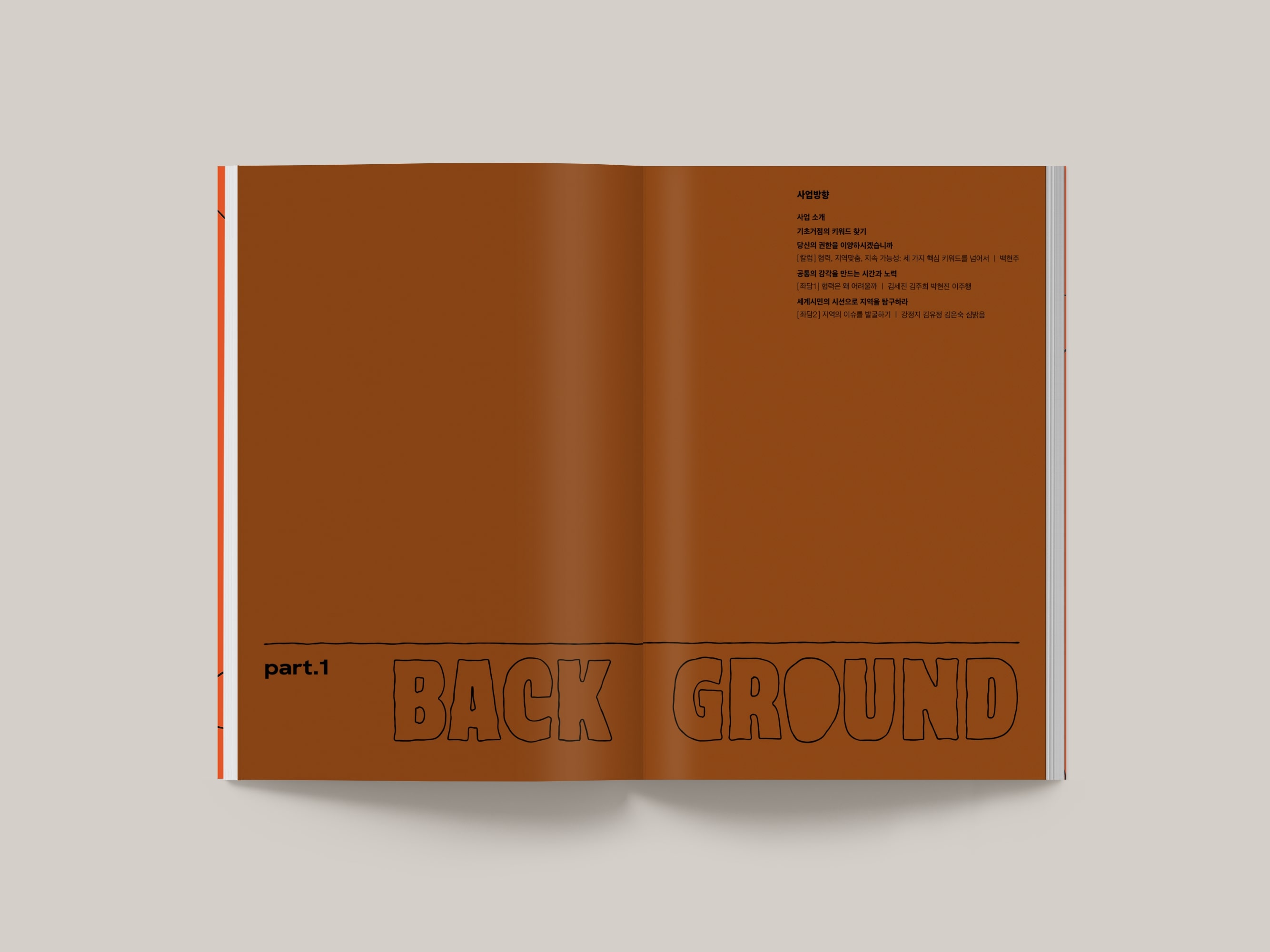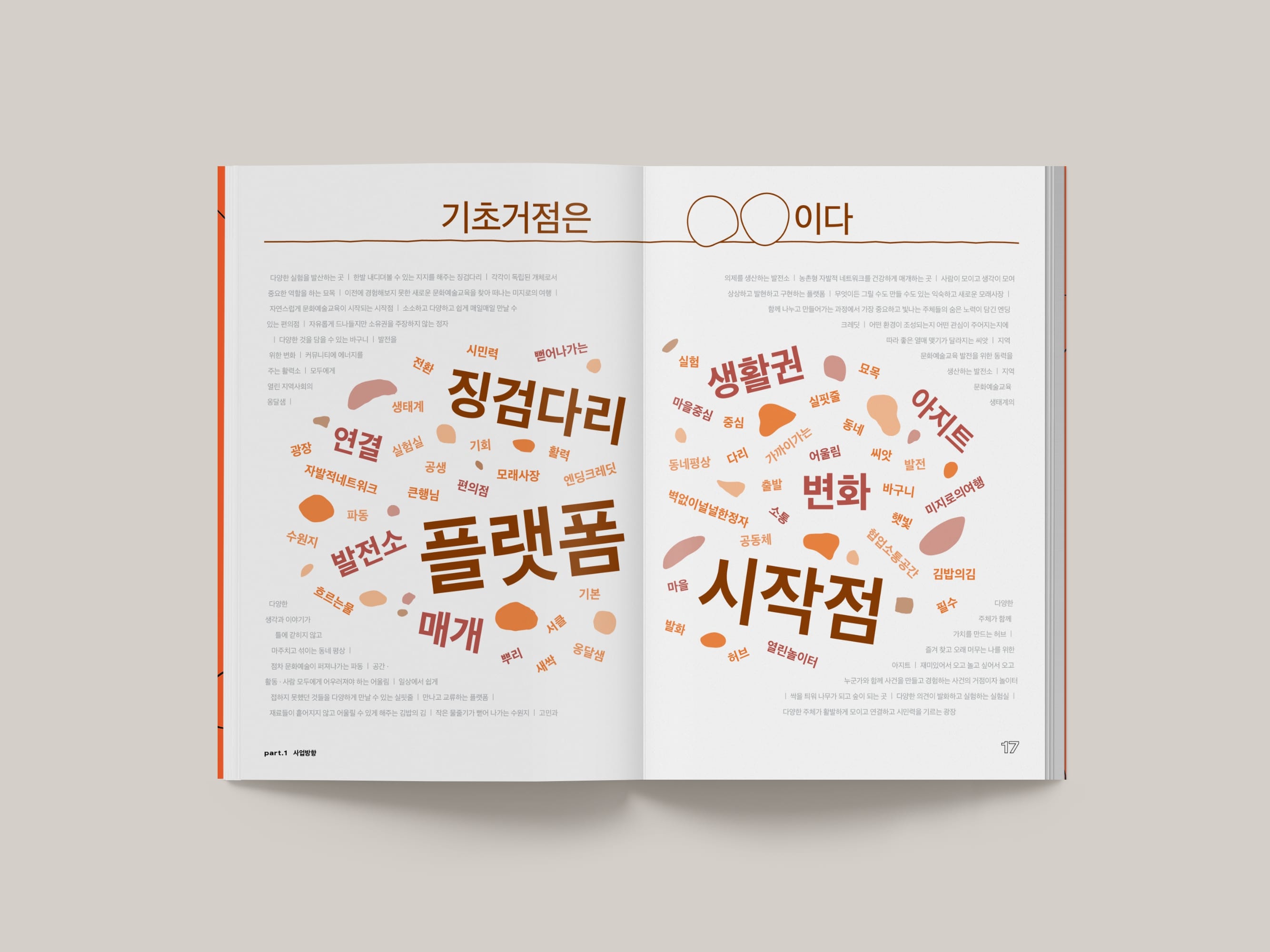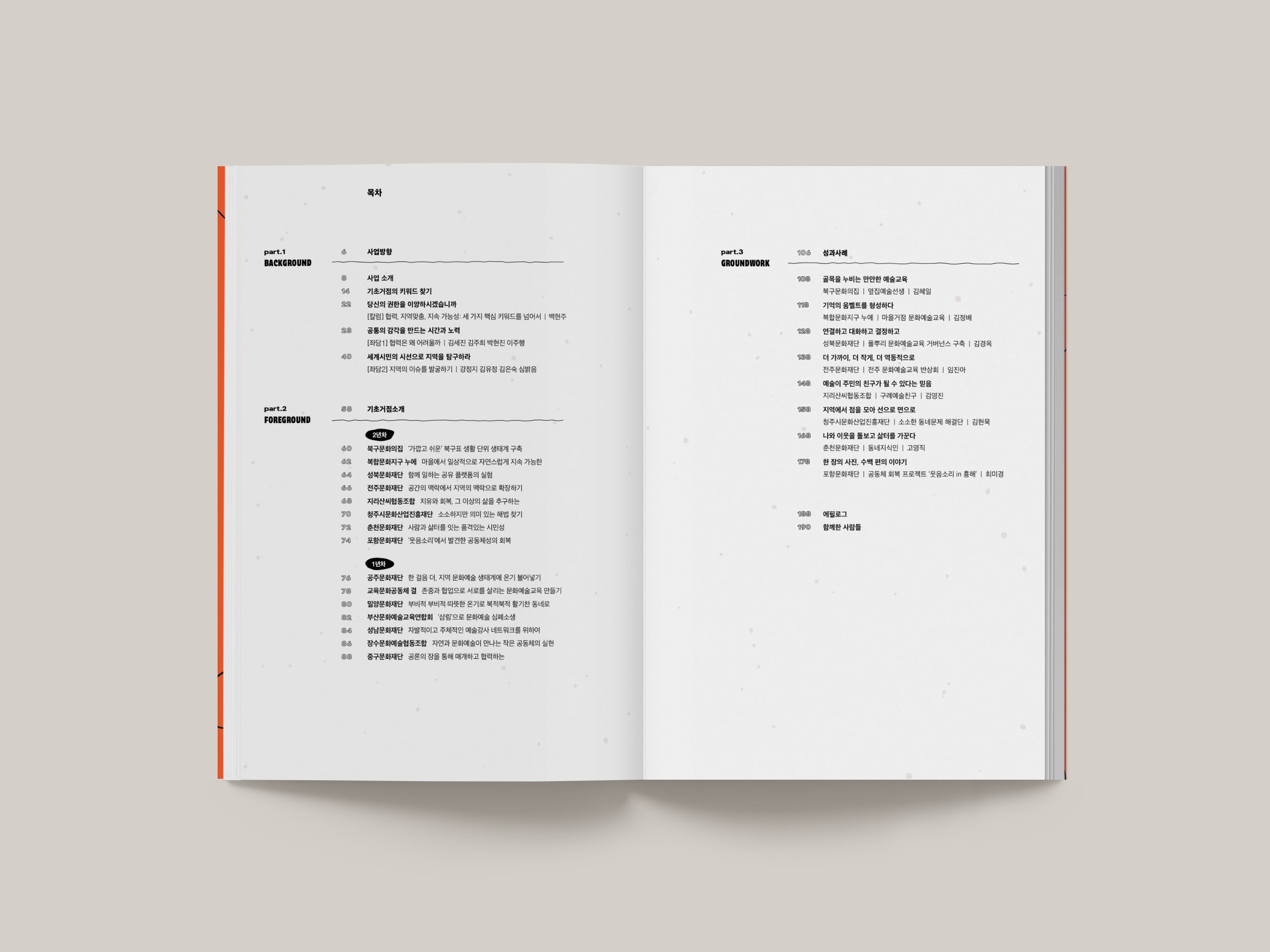 한국문화예술교육진흥원의 2021년 기초 단위 문화예술교육 거점 구축 지원사업 자료집, <온더그라운드>을 디자인했습니다. 지역의 문화예술교육을 지원하는 거점을 소개하고 지역별 교육 프로그램을 소개하는 194페이지의 책자입니다. 단단하고 우직한 그라운드 바위들을 모티브로 타이틀 글자들을 만들고 페이지 곳곳에 적용했습니다.