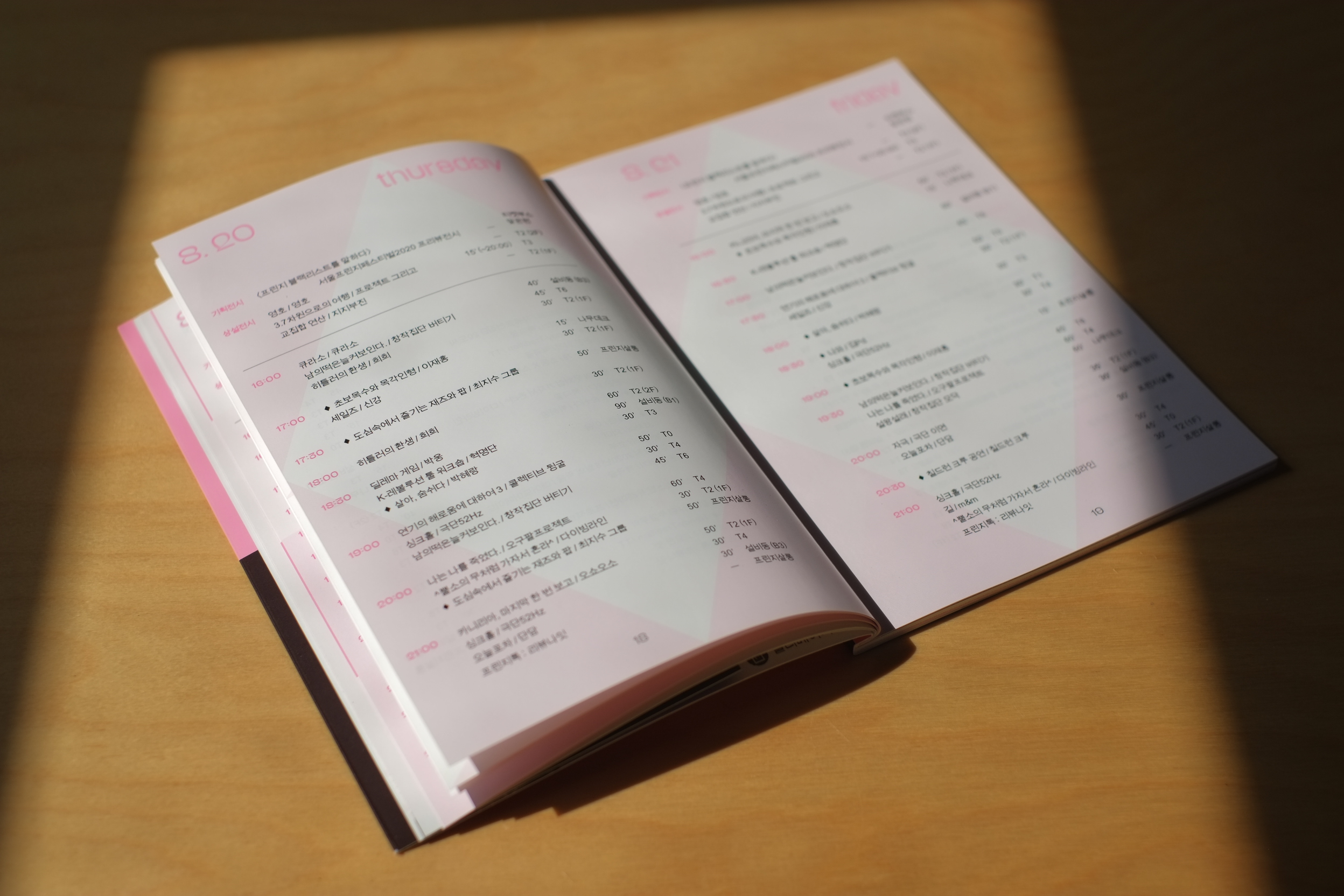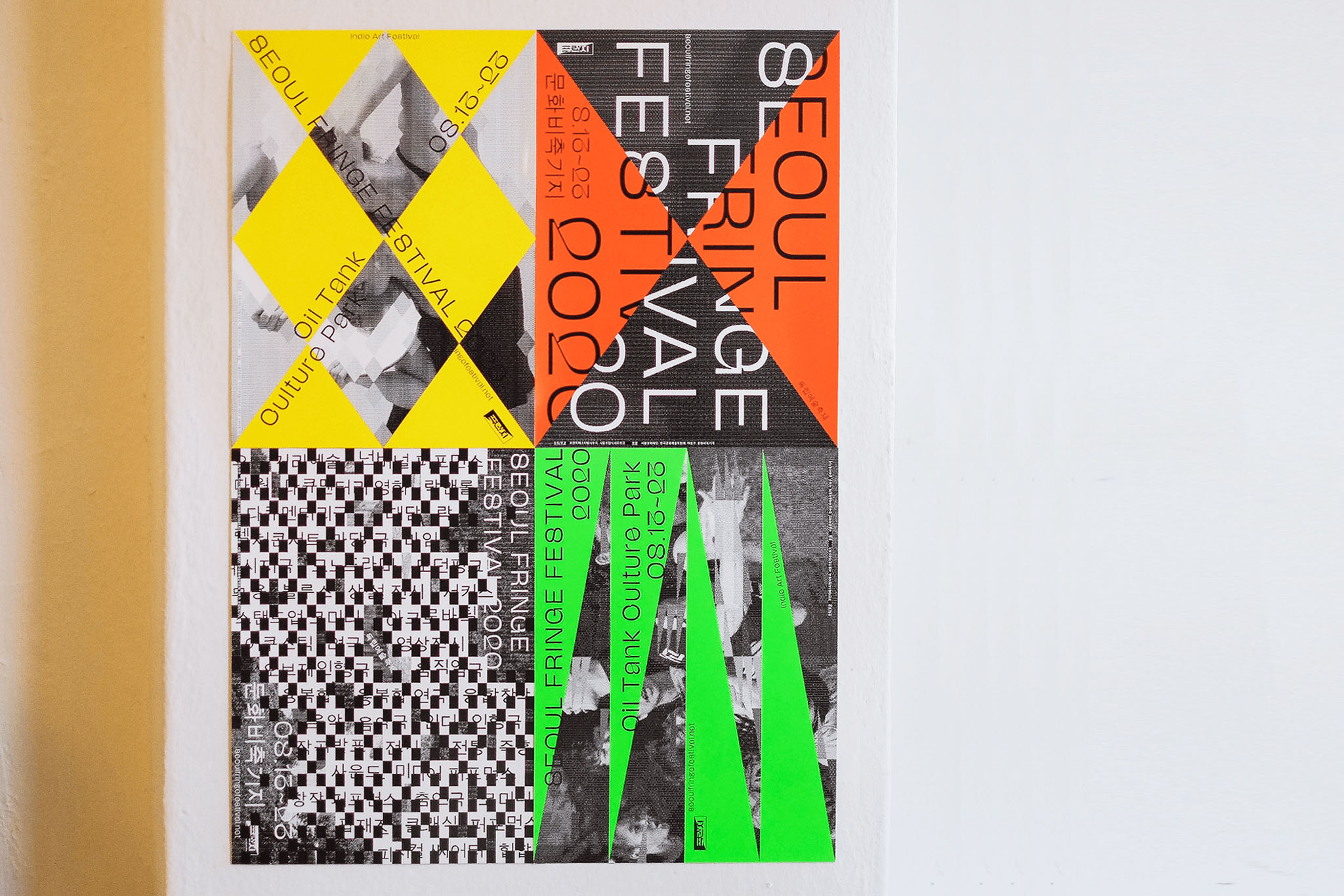 매년 여름 열리는 독립예술축제인 ‘서울 프린지 페스티벌 2020’의 공간과 그래픽을 디자인했습니다. 사선의 결합으로 만들어진 다양한 형태들은 다른 시선과 행동으로 창조되는 예술가들의 작품과 세계를 은유합니다. 상암동 문화비축기지에서 열린 축제를 위해 진입 공간의 축제 상징물과 사이니지를 디자인했고, 휴식을 위한 쉼터 공간을 연출했습니다. 또한 축제 포스터, 온라인 홍보물, 티켓, 북클릿, 기념품 등 페스티벌 비주얼 전반에 걸쳐 작업을 수행했습니다.